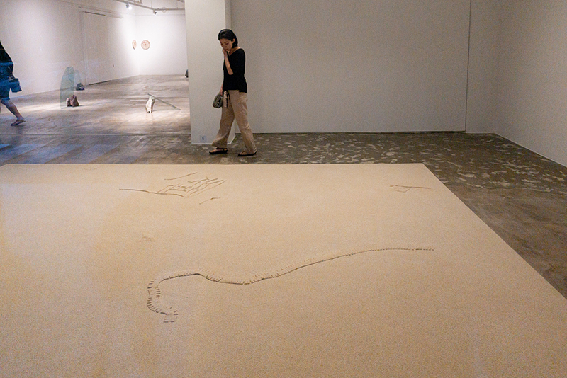 The work takes its title from a geological term describing the slow wearing away of Earth’s surface. It was the last in the series of site-specific sand installations resembling an archaeological excavation. The layered structure of sand, cloth and plastic film that holds within it an array of hand-made replicas of items such as a conveyor belt, window pane, obscure tools and fastenings, calls attention to material abundance and the excesses of our modern lifestyle.