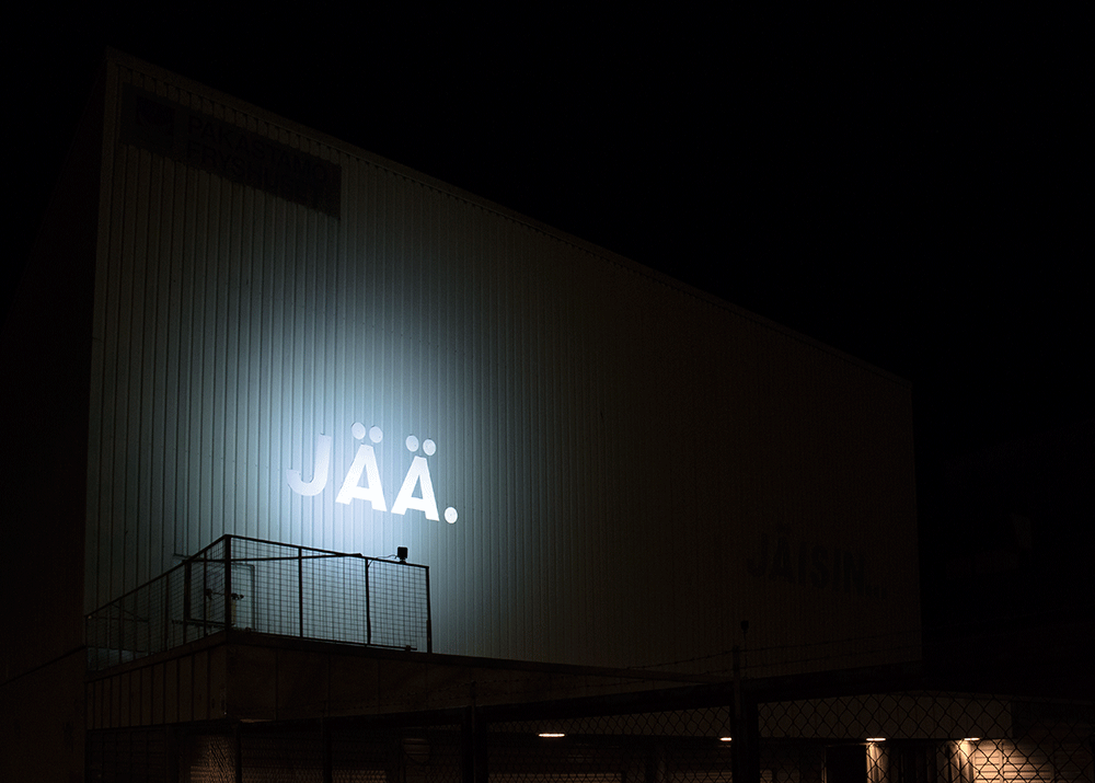 The two words ‘Jää’ and ‘Jäisin’ both have a double meaning in the Finnish language: the word ‘jää’ translates as ‘ice’ and ‘stay’, whereas ‘jäisin’ can have the meanings of ‘the iciest’ and ‘I would stay’. The absurd dialogue dictated by the pre-programmed rhythm of the spot lights to anyone passing by is a lighthearted play with the site – the wall of the city of Helsinki’s freezer house (Pakastamo) used by various catering companies and other small businesses.