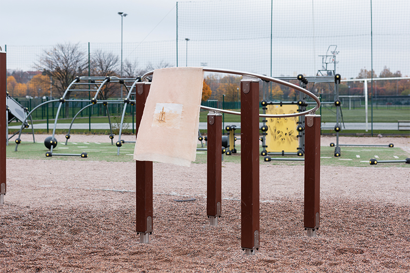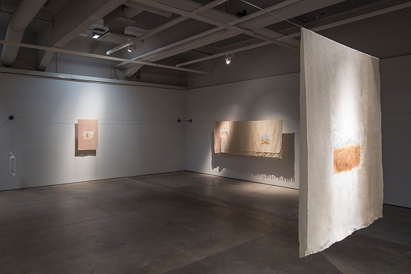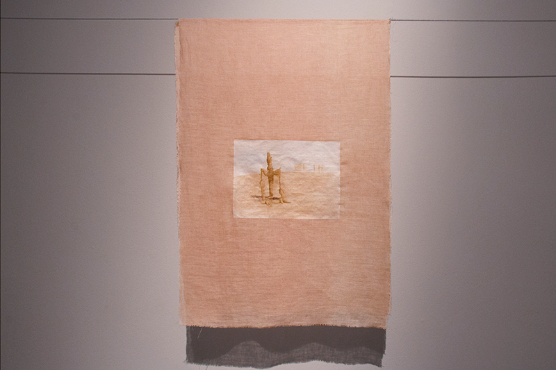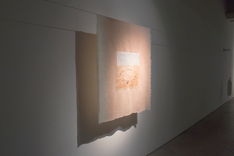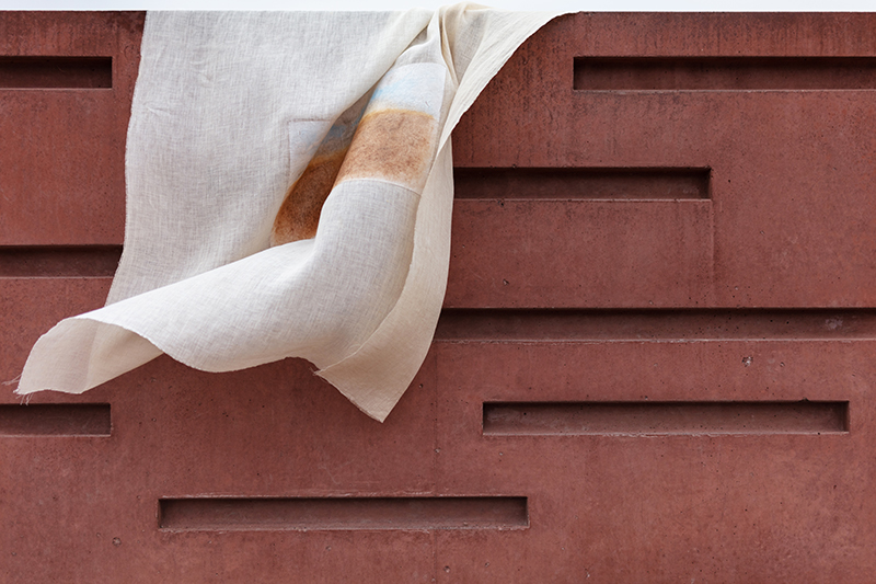 The first word in the title ‘kuu’ is ‘moon’ in Finnish, while the second ‘maa’ means ‘earth’ or ’soil’. The title could be read as ‘moon-like earth’ or ‘hot’, when the words are put together. The small gouache paintings pasted on pieces of linen depict arid landscapes and are hung from a steel wire that circles the space. A sense of the drought-driven, chlorophyll-devoid world was further enhanced by the washed-out look of the linens dyed with the very elements that make plants’ photosynthesis possible and purposeful; leafs, flowers, fruits and vegetables. The name of the exhibition ‘Spells’ can be taken to mean a stretch of time or a magical invocation, underlining the spiritual and religious approaches we turn to, when faced with inhospitable conditions, against which there are neither technological nor scientific solutions.
