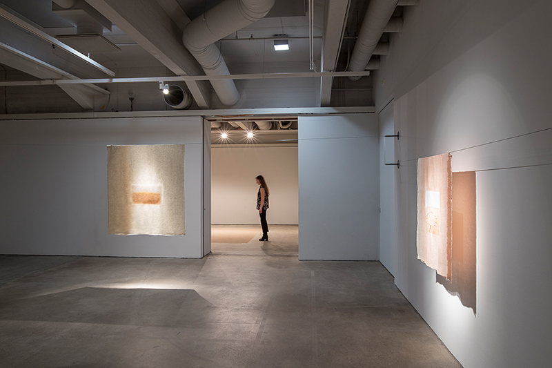 A series of five gouache paintings mounted on linen dyed with plant pigments, steel fixtures and cable, sand bag weights